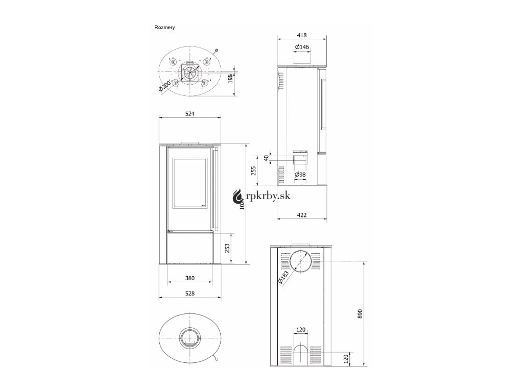 - Priemer odvodu spalín je 150 mm.